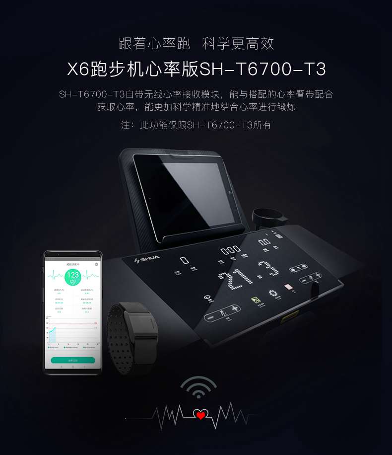 SH-T6700-T3跑步机为了帮助用户进行更加科学有效的运动,搭载YABO.COMAPP连接心率臂带实现心率控制,通过监测运动心率从而实现科学运动。