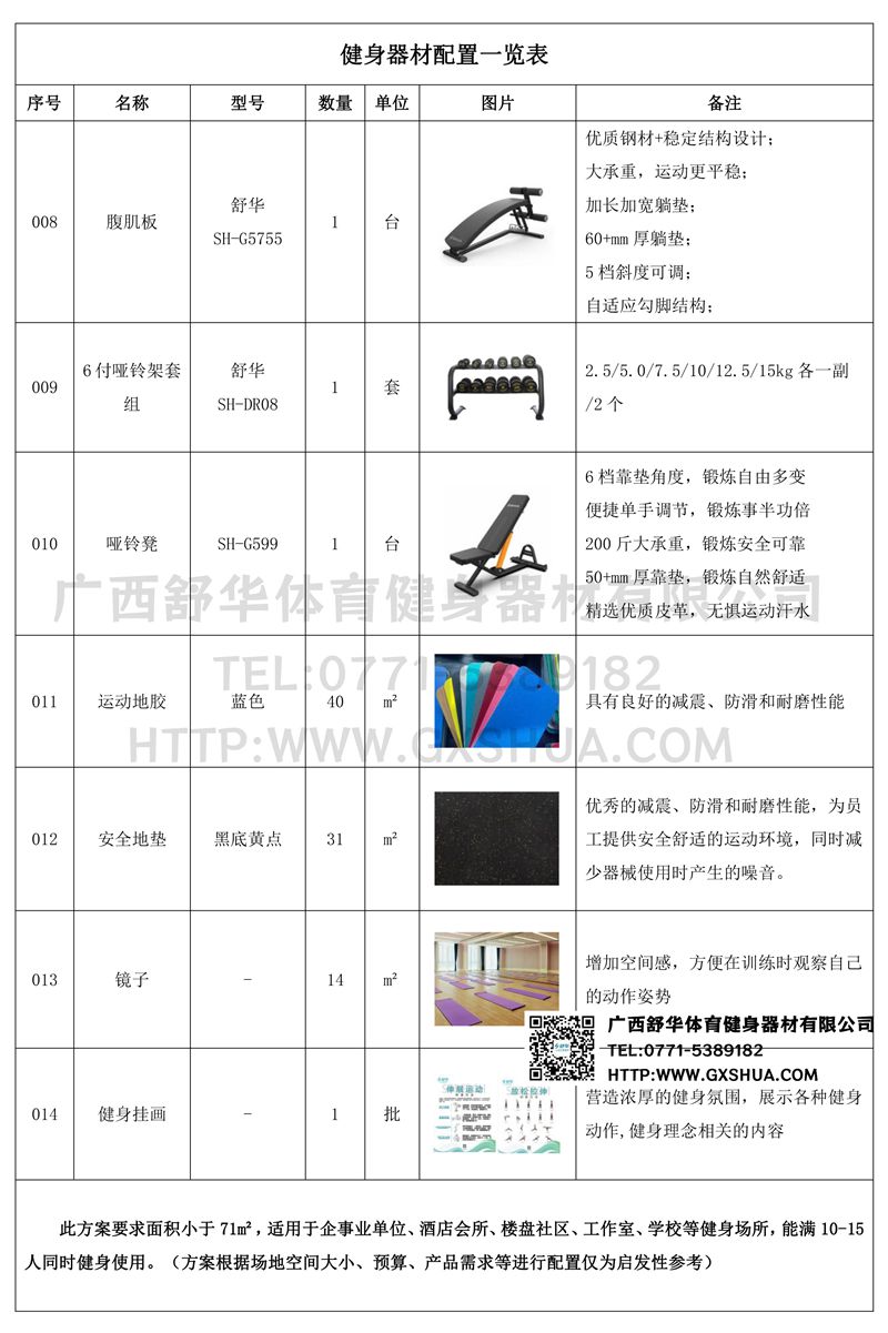 此方案要求面积小于71m²,适用于企事业单位、酒店会所、楼盘社区、工作室、学校等健身场所,能满10-15人同时健身使用。(方案根据场地空间大小、预算、产品需求等进行配置仅为启发性参考)