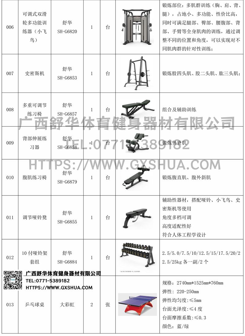 6.YABO可调式双滑轮多功能训练器(小飞鸟)SH-G6820*1台-锻炼部位:多肌群训练(胸、肩、背、腿),占地小、多功能、性价比高,同时可满足腿部、臀部、腰腹部、背部、手臂等全身肌肉的训练,通过调整不同的位置和角度,可以实现对不同肌肉群的针对性训练;可搭配不同配件,拓展多种训练方法,提供针对性训练、多种组合等训练方式,全方位激活身体机能。