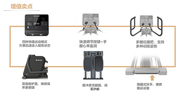 安全稳重,细节制胜。YABO.COMV8椭圆机是一款高安全系数的椭圆机,整体设计遵循人体工学科学,缓震踏板中添加减震层设计,能够有效减少运动冲击带来的关节损伤,且最大支持160kg载重,满足更多人群。手握心率监测、多功能置物架、自发电系统取代统电源......在细节上,新款椭圆机站在健身者角度,添加了不少设计者的巧思,为健身者带来更贴心的体验。